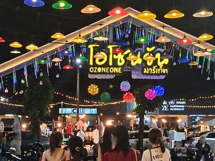 ยามพระอาทิตย์ลับขอบฟ้า ไฟจากร้านค้าเริ่มสว่างเป็นดวง ๆ แสงสีนวล ๆ สะท้อนกับพื้นทางเดิน กลิ่นน้ำจิ้มซีฟู้ด กลิ่นหมูกระทะ กลิ่นกาแฟคั่วหอม ๆ ลอยปนเปกันอย่างลงตัว เสียงกีตาร์จากเวทีกลางดังเบา ๆ แทรกกับเสียงหัวเราะของกลุ่มเพื่อนที่นั่งล้อมโต๊ะกินหมูย่าง หรือคู่รักที่เดินจูงมือกันอย่างช้า ๆ… ทั้งหมดนี้ไม่ใช่ฉากจากหนัง แต่คือ “ชีวิตจริง” ที่คุณสัมผัสได้ทุกคืนที่โอโซนวัน